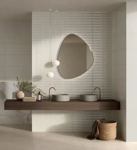 La teinte Calce, un blanc doux et lumineux, illumine les intérieurs tout en apportant une sensation de pureté et d’équilibre. Ce carrelage tridimensionnel joue avec la lumière pour créer des effets d’ombre et de profondeur, transformant un mur en un élément décoratif d’exception.