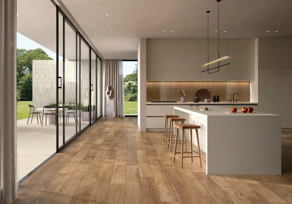 Son format rectifié garantit des joints fins et discrets, accentuant l’effet d’un parquet continu et harmonieux. Le ton bois clair du Natural RT apporte chaleur et luminosité à toutes les pièces, qu’il s’agisse du salon, de la cuisine ou de la chambre.
