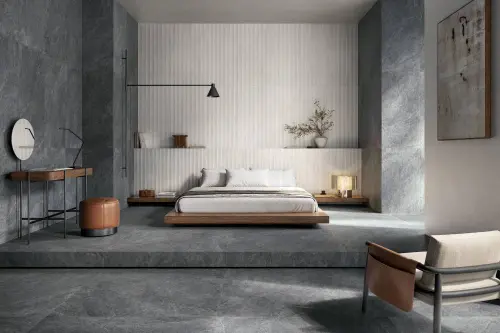 La collection ERAS de Refin s’inspire des surfaces sculptées par le temps et les éléments naturels, capturant les textures et nuances qui confèrent à chaque pierre son caractère unique. Le modèle BLACK R MATT évoque la profondeur et l’élégance de la pierre noire, offrant des nuances délicatement nuancées qui enrichissent visuellement les sols et les murs. La surface Silktech mate procure un toucher agréable et assure une adhérence R10, parfaite pour tous les espaces intérieurs.