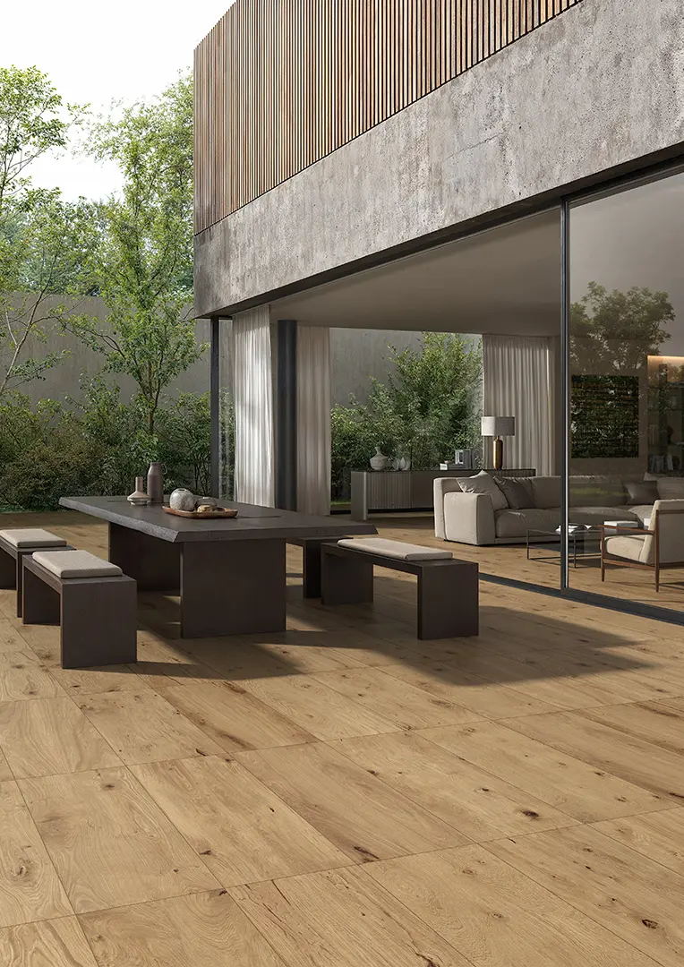 Le carrelage extérieur 20mm Sequoia Rett combine l’esthétique chaleureuse du bois naturel avec la performance technique d’une dalle en grès cérame épaisseur 2 cm. Il reproduit fidèlement les nuances et le veinage du bois, tout en étant parfaitement adapté aux contraintes extérieures.