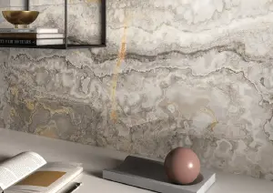 Le carrelage ORO de LaFaenza Ceramica s'inspire de la beauté luxueuse de l'onyx. Avec son esthétique raffinée et ses veines délicates, il évoque l'élégance naturelle de cette pierre précieuse. Idéal pour les sols et les murs, il apporte une touche sophistiquée et lumineuse à tout espace, que ce soit pour des intérieurs modernes ou classiques. La collection se distingue par des finitions impeccables et une palette de teintes élégantes, parfaites pour sublimer les salles de bain.