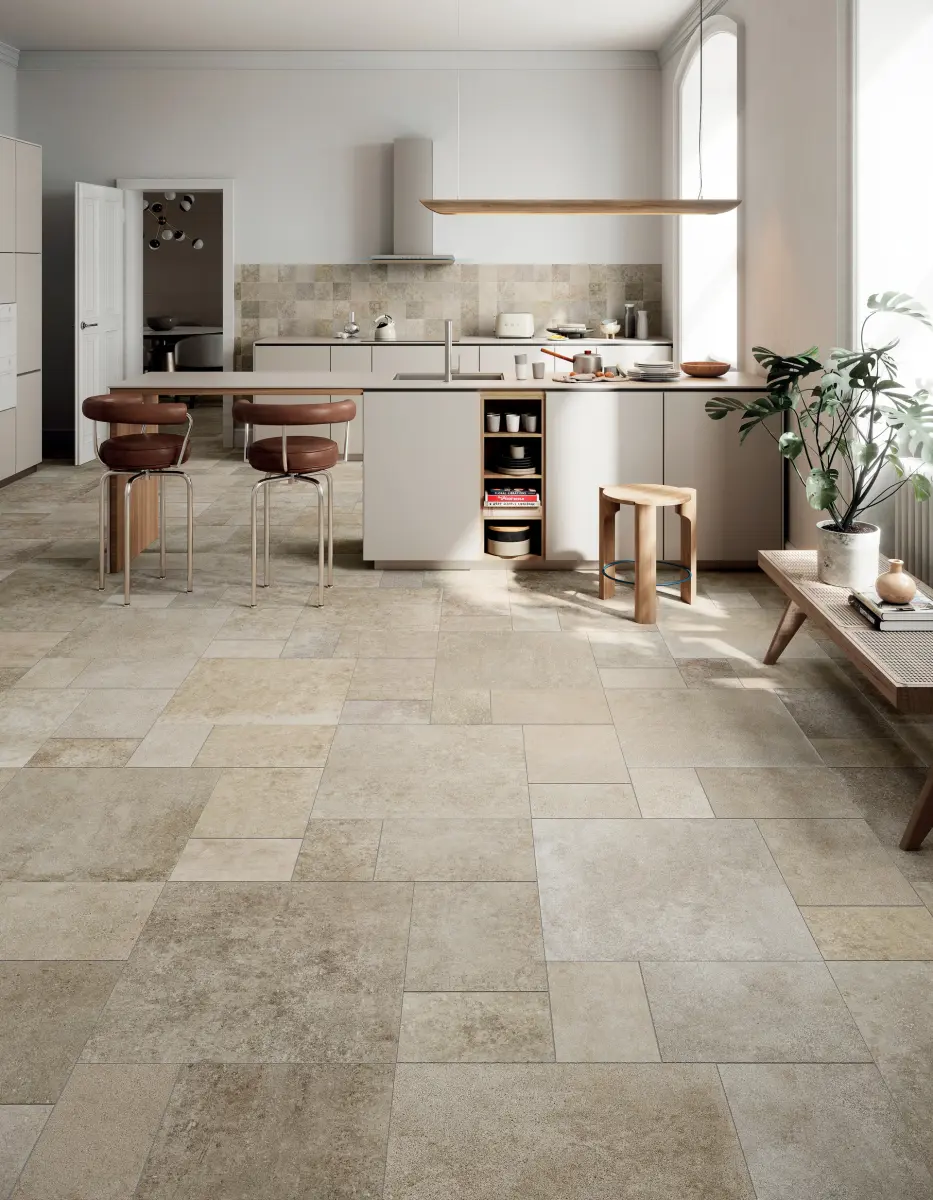 Sa surface mate légèrement texturée restitue fidèlement les détails minéraux de la pierre calcaire, tandis que ses variations chromatiques naturelles créent un rendu riche et harmonieux, idéal pour les espaces intérieurs au style à la fois moderne et intemporel.