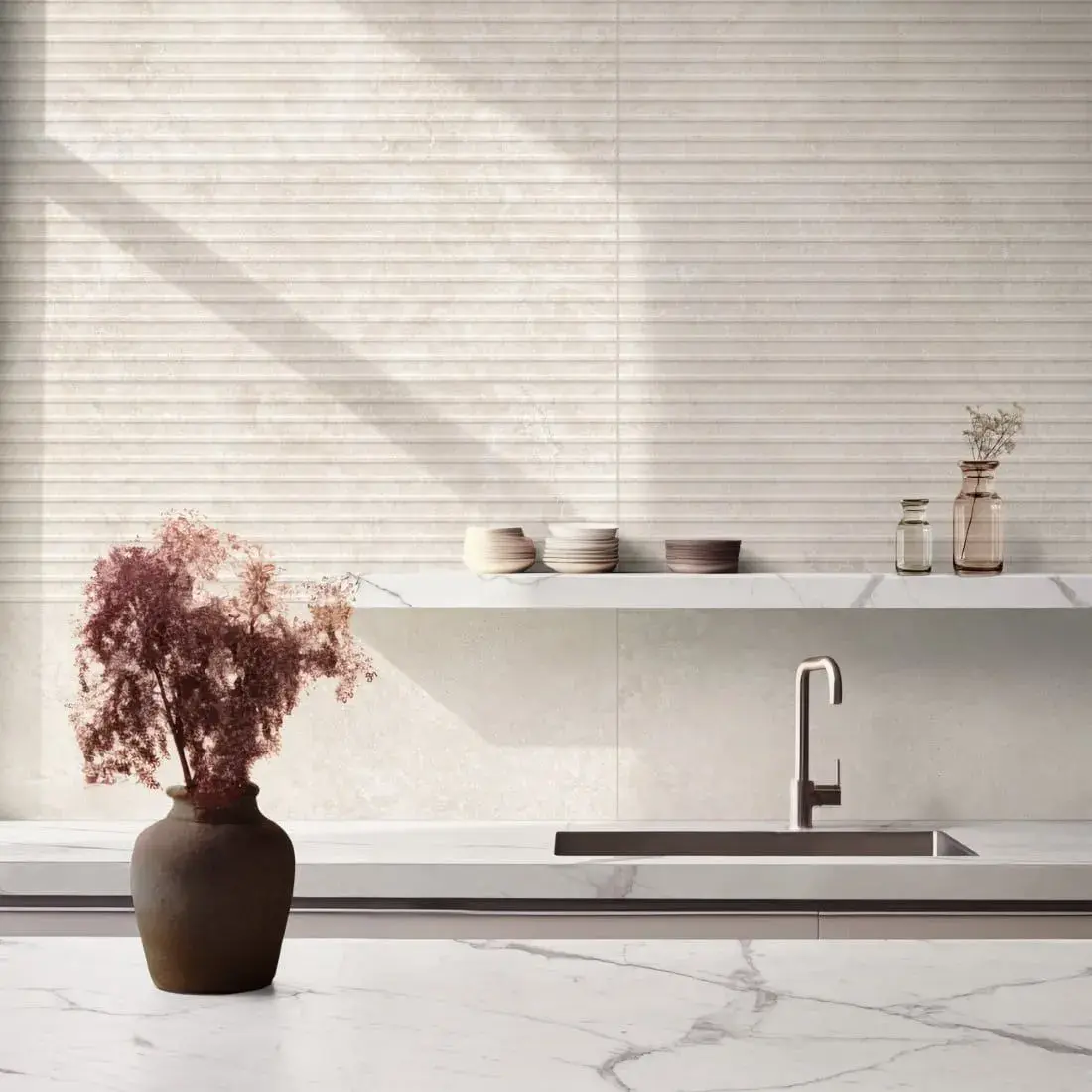 Le Struttura 3D Dorica Cross Bianco Rett de la série Travertino Wall signée Ragno revisite le travertin blanc dans une version architecturale et artistique, dédiée à la décoration murale intérieure. Sa structure tridimensionnelle Dorica Cross, composée de lignes verticales croisées et de légères ondulations, évoque la majesté des colonnes doriques tout en apportant une touche de modernité.