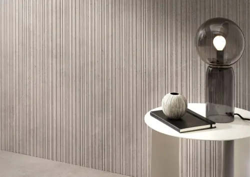 La série OSMOS de Refin réinvente l’esthétique du béton en y intégrant des reliefs tridimensionnels d’une grande finesse. Le modèle RIBBED TORTORA R en est une interprétation subtile, où la teinte taupe douce et les striures verticales élégantes transforment le mur en une véritable surface architecturale vivante. Chaque onde de la texture capte la lumière et la rediffuse avec naturel, créant un effet graphique apaisant et sophistiqué.